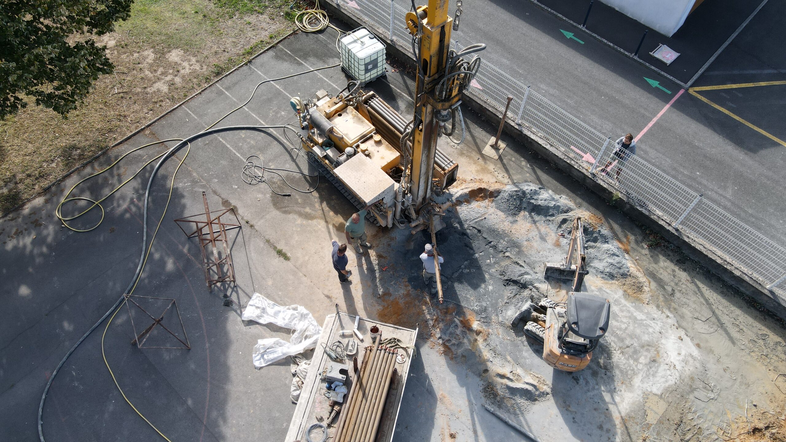 Dans le cadre de ce projet, 14 sondes géothermiques ont été installées sous la cour de l'école. Ces sondes, une fois les travaux terminés, deviennent totalement invisibles, permettant ainsi de restituer l’espace extérieur aux élèves sans perdre un mètre carré de surface. Cette intégration discrète préserve le confort et l’accessibilité des lieux, répondant aux besoins de l’établissement sans compromettre le quotidien des élèves ni des enseignants.