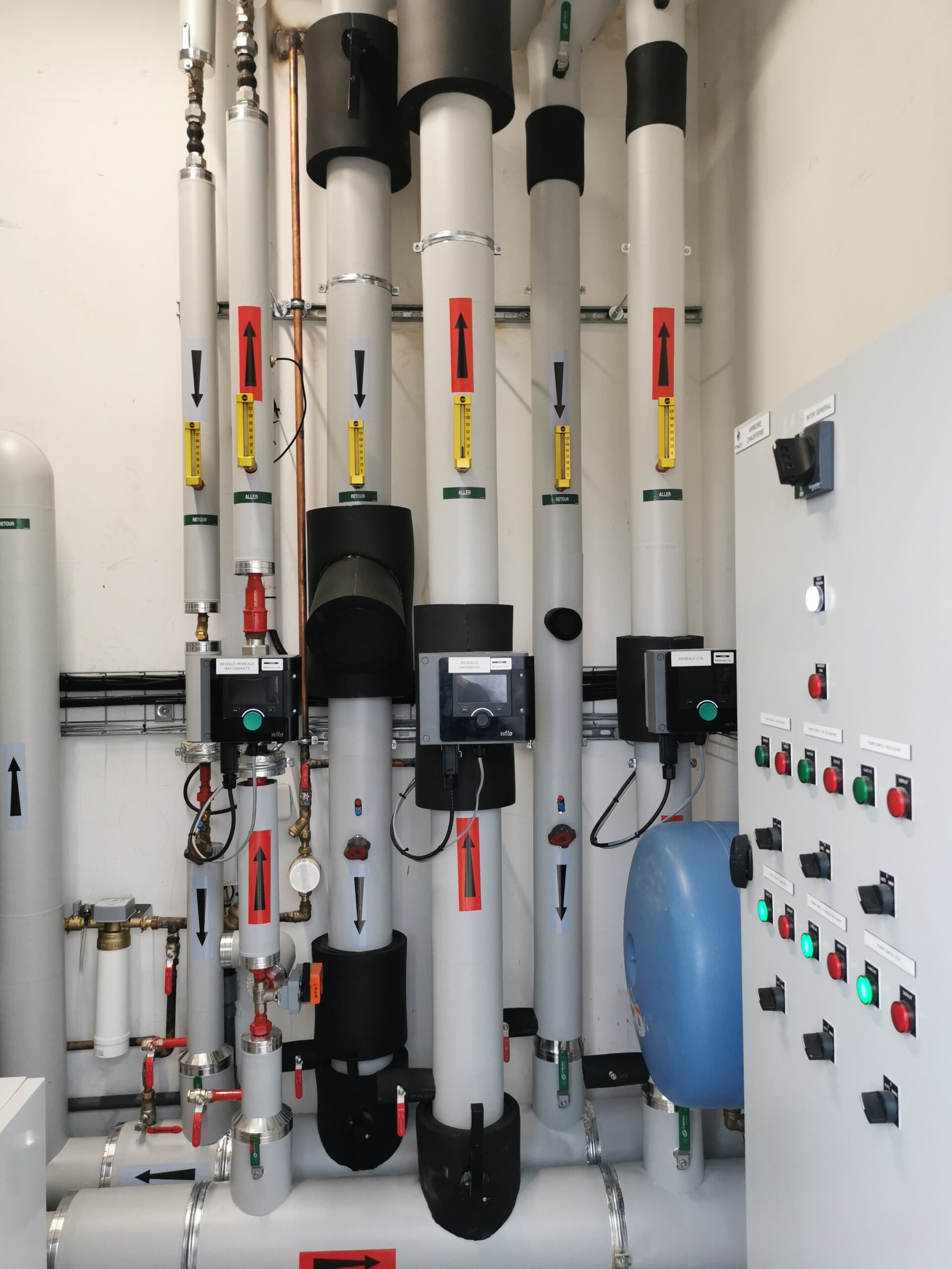 Pour répondre aux variations climatiques et aux besoins de confort, notre installation est également équipée d’un système de froid actif. Si le géocooling seul ne suffit pas à maintenir des températures agréables lors de fortes chaleurs, le froid actif prend le relais pour assurer un rafraîchissement supplémentaire, tout en restant parfaitement intégré au réseau géothermique.